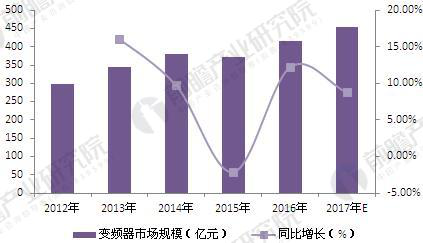 近年来,我国变频器行业的市场规模总体呈上升态势,但增速有所下降。2016年我国变频器行业的市场规模为416.77亿元,平均4年复合增长率为8.74%。据此测算,2017年我国变频器市场规模约453.2亿元。