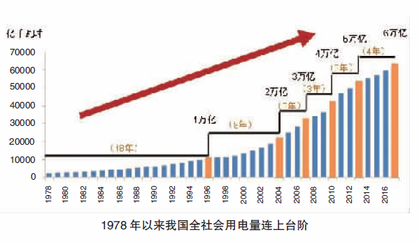 电力消费规模走过了由小变大、屡上台阶的辉煌历程。1978年,全国电网覆盖率不到一半,全社会用电量仅为2498亿千瓦时。随着经济的快速发展和人民生活水平的明显提升,我国电力消费规模不断创出新高。在经历了漫长的18年后,我国全社会用电量终于在1996年突破1万亿千瓦时,随后电力消费进入了快速增长期,全社会用电量由1万亿千瓦时上升至2万亿千瓦时用了8年(1997~2004年);随后的9年中,每3年上一个台阶,分别在2007年、2010年和2013年实现了3万亿、4万亿、5万亿千瓦时的突破。2011年,我国全社会用电量位居世界第一位。随着经济“新常态”阶段的到来,我国用电量增长的步伐略有放缓,但也仅用4年的时间,就突破了6万亿千瓦时,于2017年达到6.4万亿千瓦时,比改革初期增长了24倍多,比整个美洲或欧洲的用电量还多。